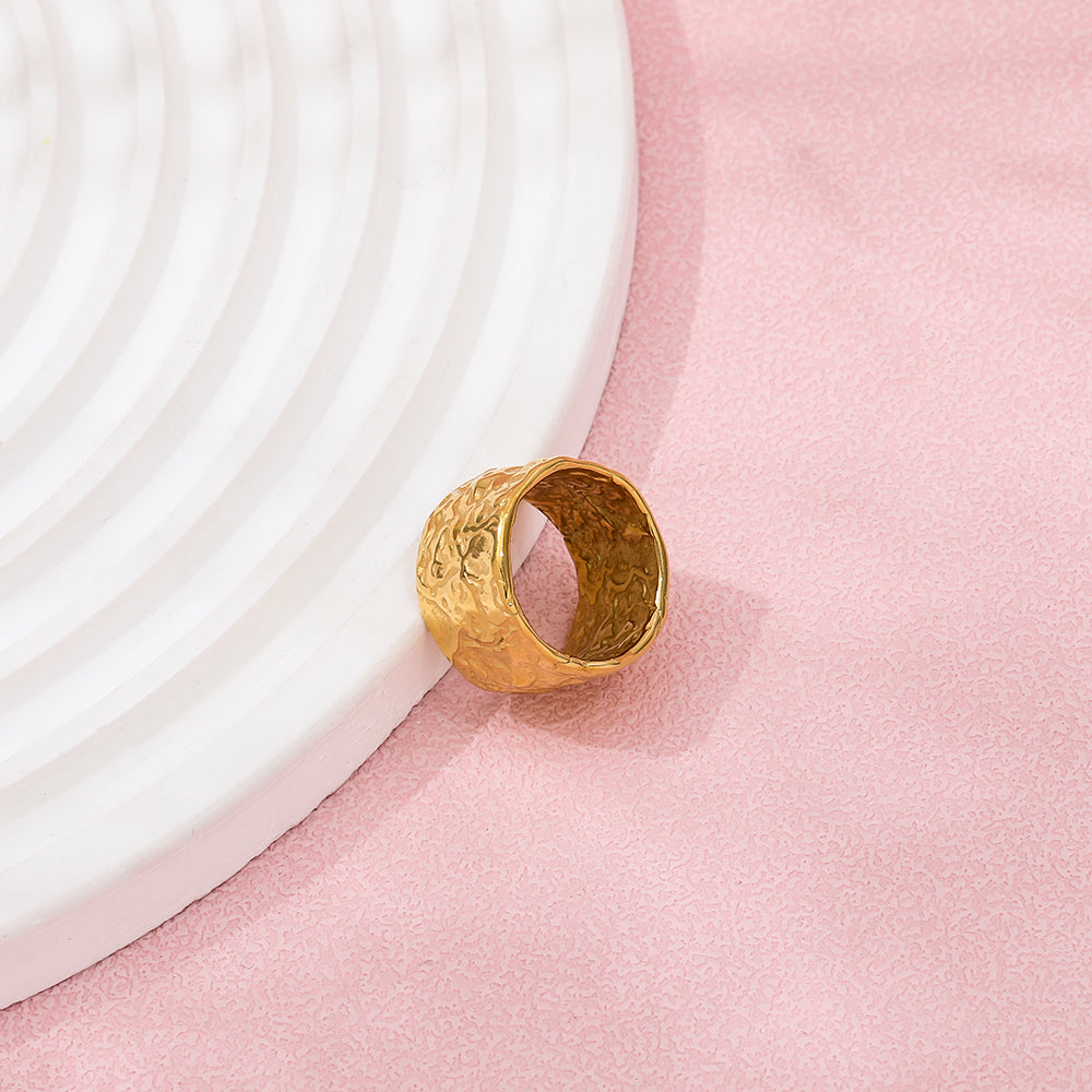 Fabricado en acero inoxidable 316L con recubrimiento PVD dorado, este anillo es hipoalergénico, resistente al agua y duradero, asegurando que conserve su brillo y estilo a lo largo del tiempo.