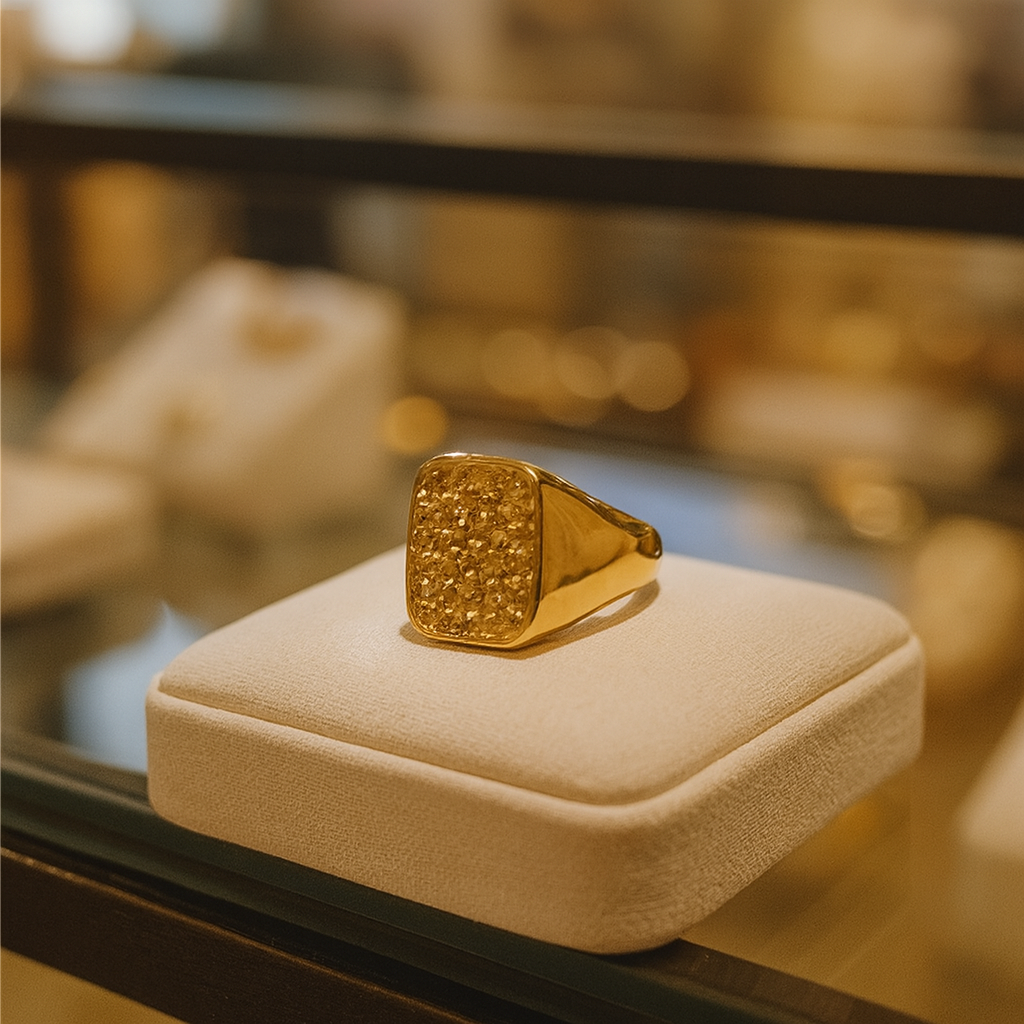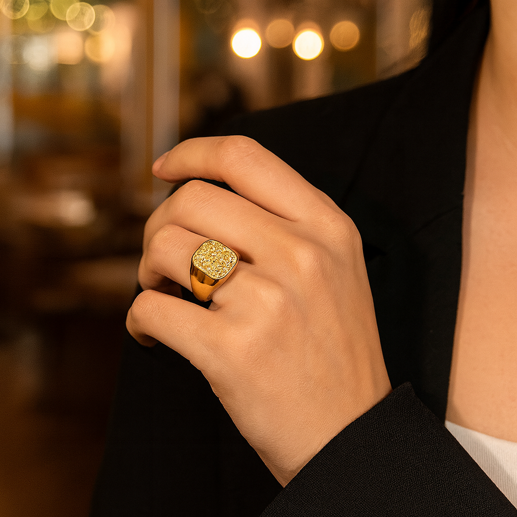 <p>El Anillo Rhéa es una joya de carácter fuerte y sofisticado que resalta por su diseño tipo sello con acabado texturizado en la parte frontal. Su presencia elegante lo convierte en una pieza ideal para destacar en cualquier ocasión, aportando un aire de seguridad y estilo propio. Fabricado en acero inoxidable 316L con recubrimiento PVD dorado, este anillo es hipoalergénico, resistente al agua y altamente duradero. Una pieza versátil que combina lo clásico con lo moderno.</p>