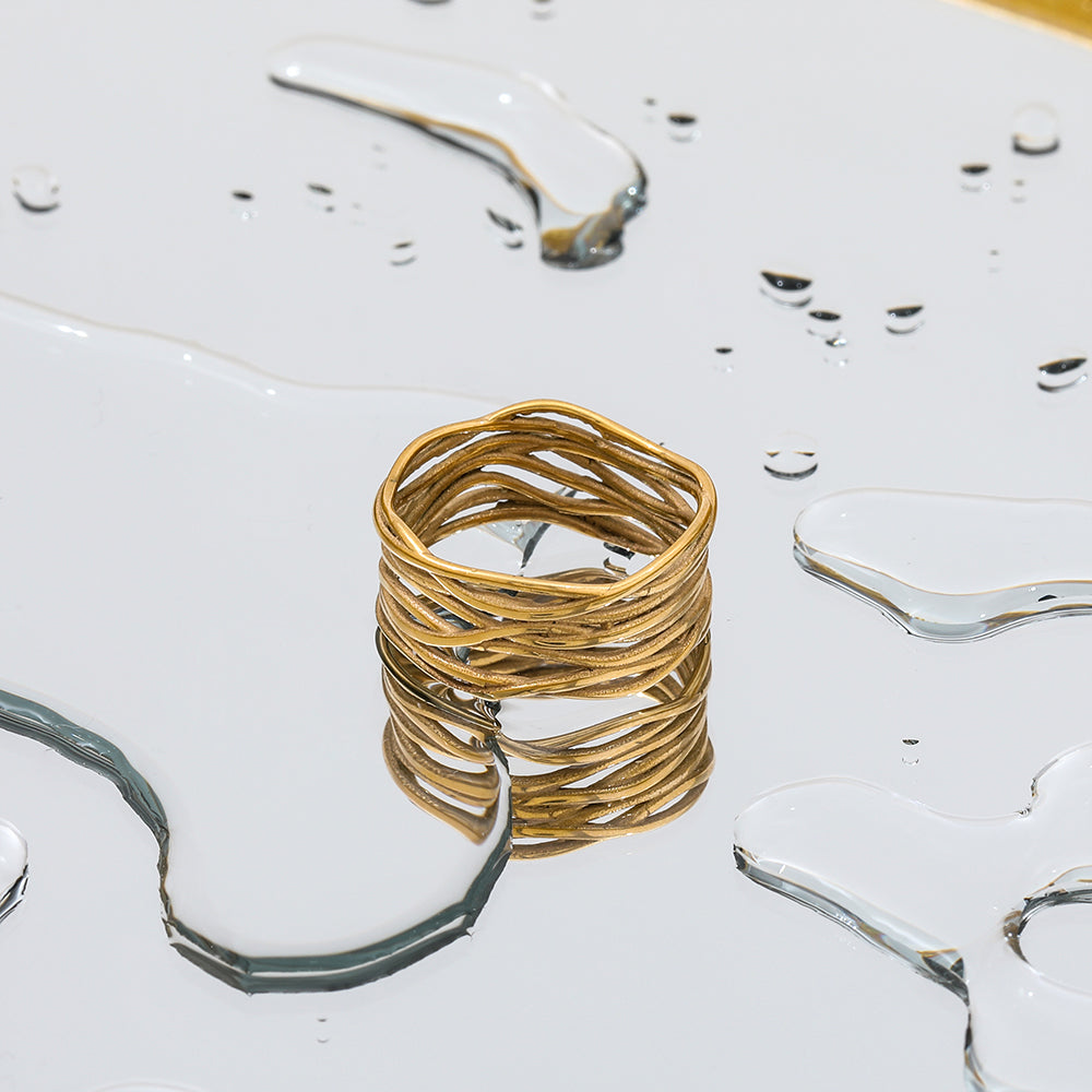 <p>El Anillo Selvina es una pieza moderna y versátil que se distingue por su diseño entrelazado de múltiples líneas doradas, creando un efecto de movimiento y dinamismo. Es perfecto para quienes buscan un accesorio con carácter que complemente tanto atuendos casuales como elegantes. Elaborado en acero inoxidable 316L con recubrimiento PVD dorado, este anillo es hipoalergénico, resistente al agua y de alta durabilidad, asegurando un brillo impecable con el paso del tiempo.</p>
