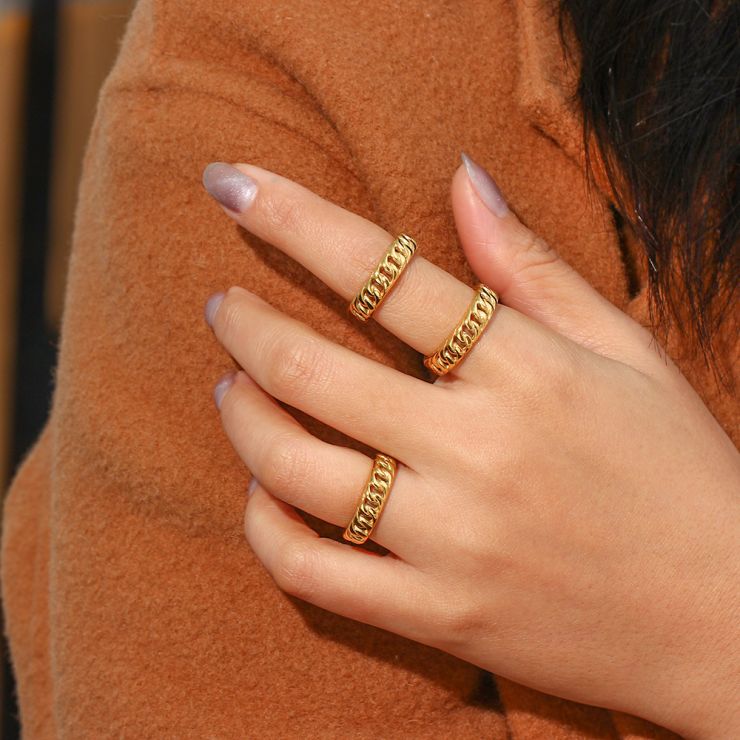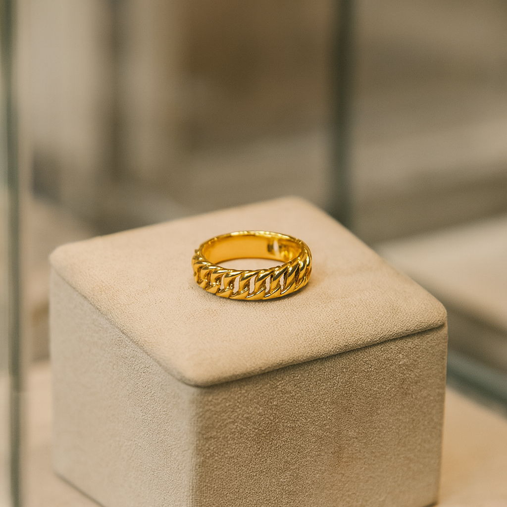 <p>Elaborado en acero inoxidable 316L con recubrimiento PVD dorado, este anillo es hipoalergénico, resistente al agua y muy duradero, manteniendo su brillo impecable incluso con el uso constante.</p>
