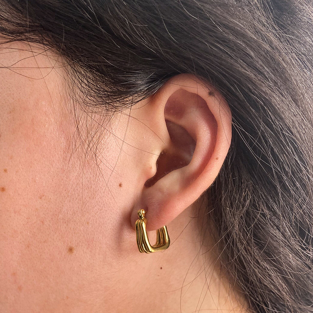 Los aretes Claudia destacan por su silueta cuadrada con detalles en relieve que crean un efecto moderno y llamativo. Su tamaño equilibrado los hace ideales para llevar con comodidad durante todo el día, aportando un toque sofisticado a cualquier conjunto, ya sea casual o elegante.