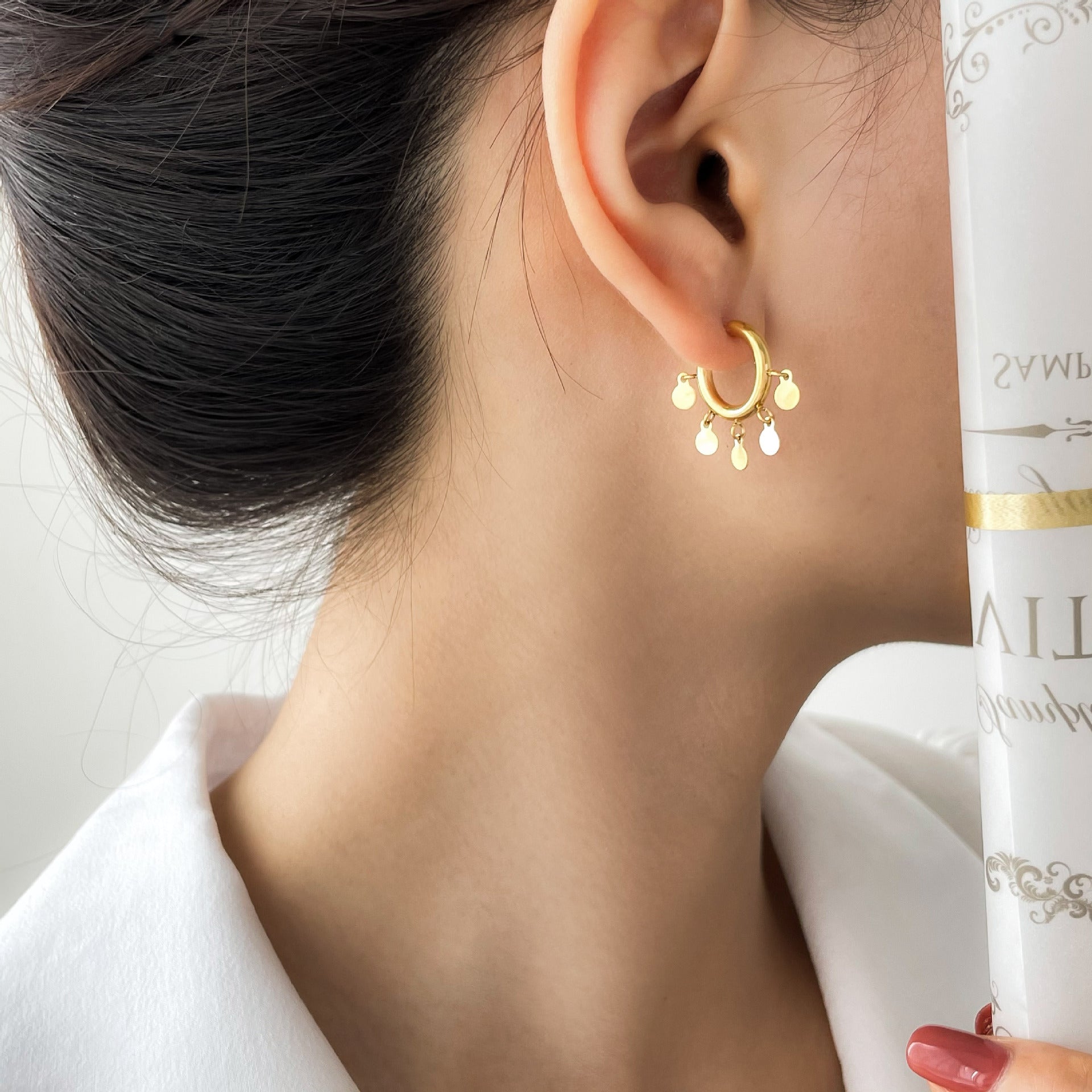Los Aretes Naomi destacan por su diseño de aro pequeño decorado con colgantes circulares que aportan movimiento y un estilo fresco y elegante. Su silueta delicada los convierte en el accesorio ideal para mujeres que buscan un toque distintivo y versátil, perfecto para realzar looks casuales o dar un aire sofisticado a un outfit de noche. Elaborados en acero inoxidable 316L con recubrimiento PVD dorado, son hipoalergénicos, resistentes al agua y altamente duraderos, manteniendo su brillo impecable con el paso del tiempo.
