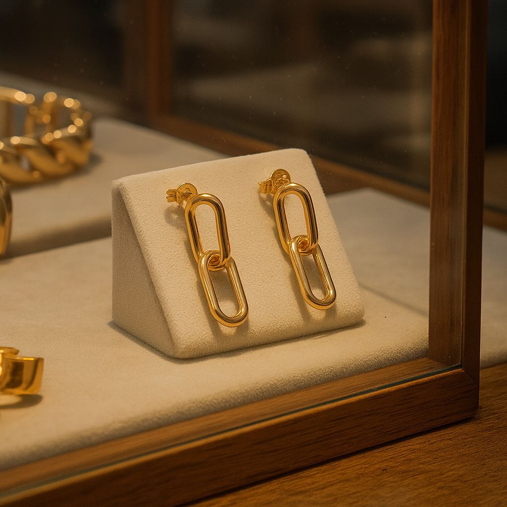 Los Aretes Serafina cautivan con su diseño de eslabones entrelazados que simbolizan conexión y fuerza interior. Su estilo moderno con un toque vanguardista los convierte en una pieza ideal para mujeres seguras que buscan destacar en cada detalle. Perfectos para eventos elegantes, salidas nocturnas o para elevar un look casual, estos aretes añaden dinamismo y sofisticación. Elaborados en acero inoxidable 316L con recubrimiento PVD dorado, son hipoalergénicos, resistentes al agua y de alta durabilidad, garantizando comodidad y un brillo impecable por mucho más tiempo.