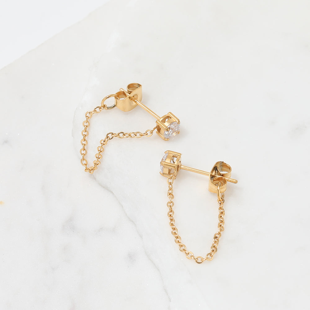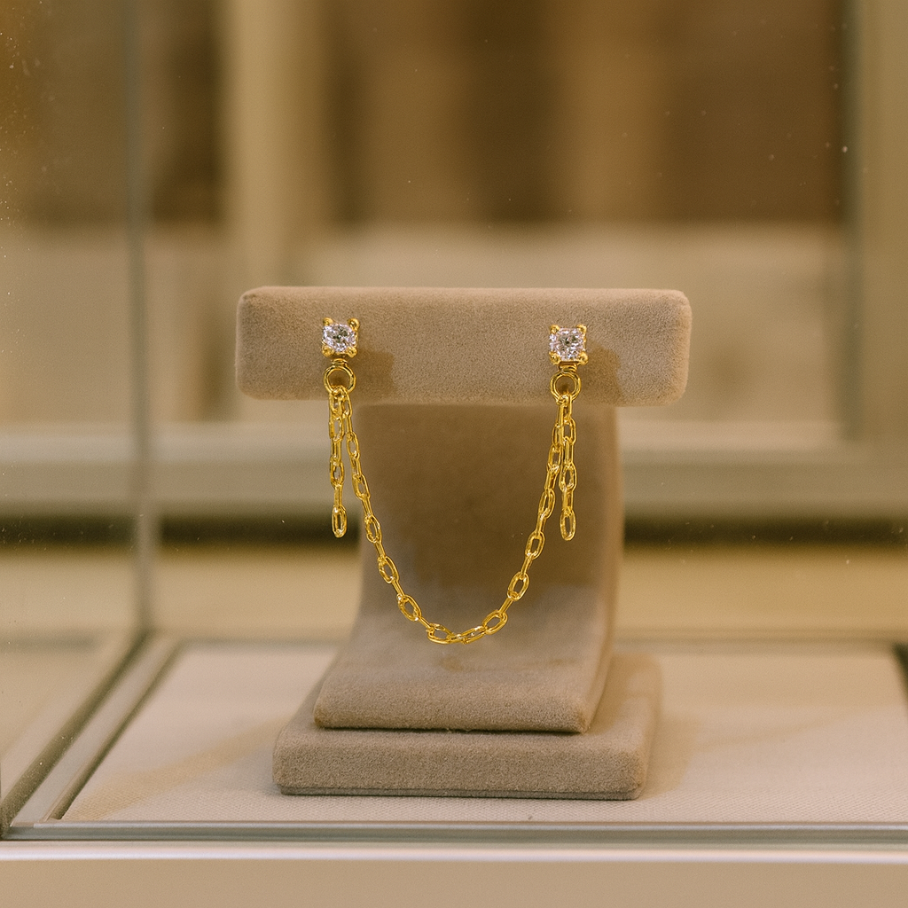 Los aretes Ximena combinan la delicadeza de una piedra brillante con el detalle contemporáneo de una cadena trasera, creando una pieza única y elegante. Su estilo versátil los convierte en el complemento ideal para elevar cualquier look, desde el más sencillo hasta el más sofisticado.