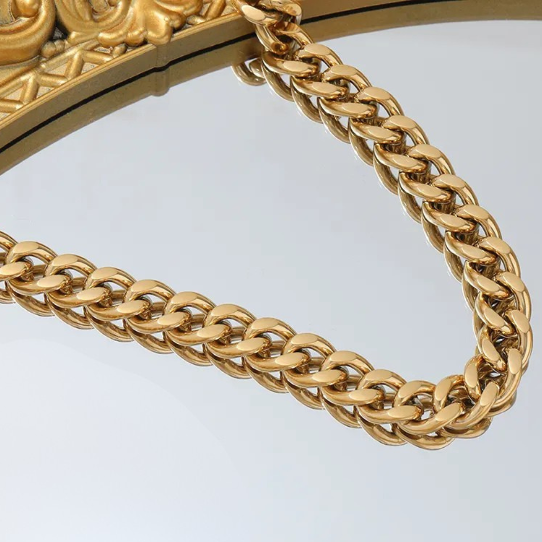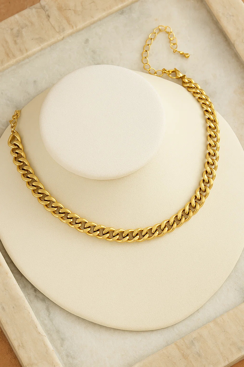 Fabricada en acero inoxidable de alta calidad con recubrimiento PVD en tono dorado 14K, es una pieza pensada para durar. Es resistente al agua, al sudor y al desgaste diario, lo que la convierte en tu aliada perfecta para cualquier ocasión —ya sea para brillar en un evento especial o acompañarte en tu día a día sin perder color ni brillo.