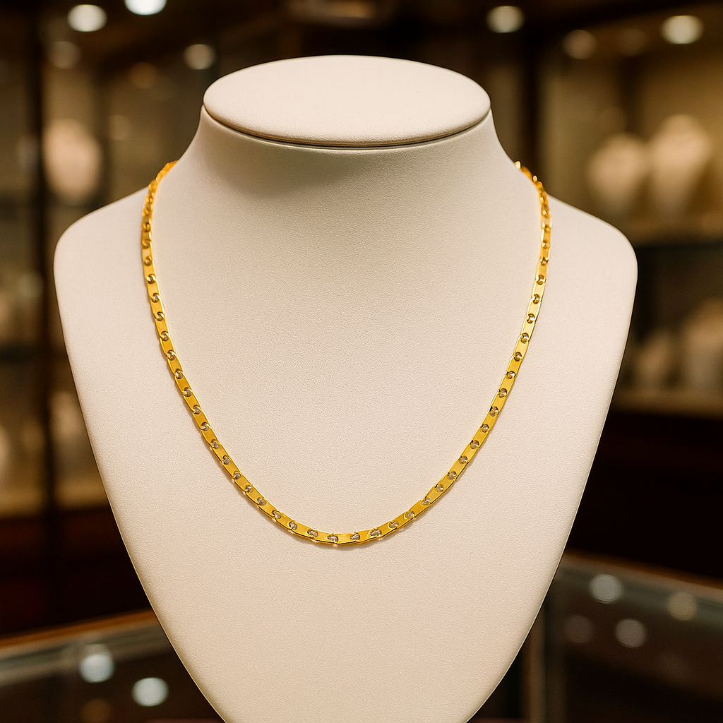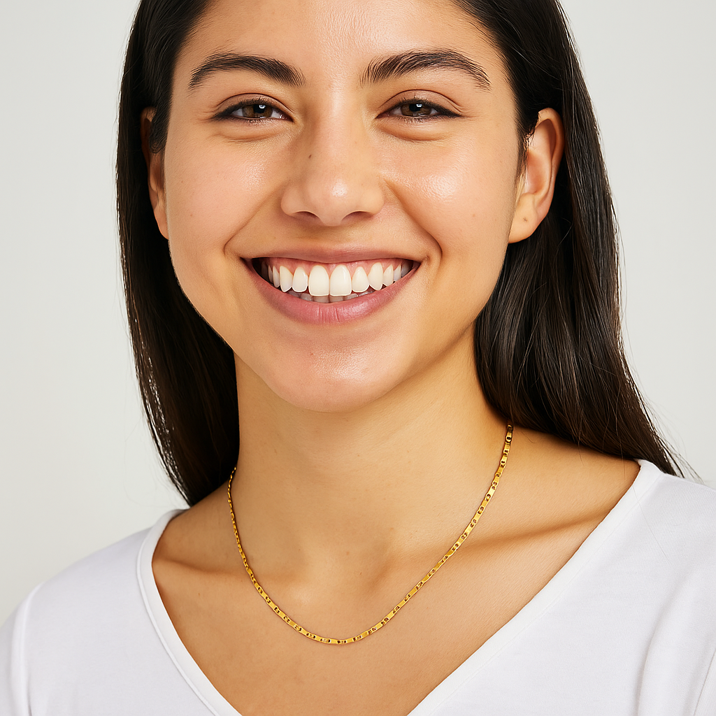 El Collar Adela es una joya que equilibra sencillez y sofisticación en un diseño atemporal. Su cadena dorada con eslabones delicados y detalles brillantes lo convierten en un accesorio versátil, ideal para elevar desde un look casual hasta un outfit elegante de noche.
