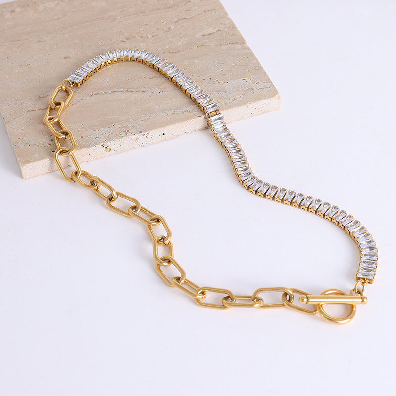 El Collar Amelí une lo mejor de dos mundos: una cadena dorada de eslabones grandes con una línea de circonitas brillantes que aportan un toque de sofisticación. Su diseño moderno y su cierre tipo toggle al frente lo convierten en un accesorio llamativo, elegante y versátil.