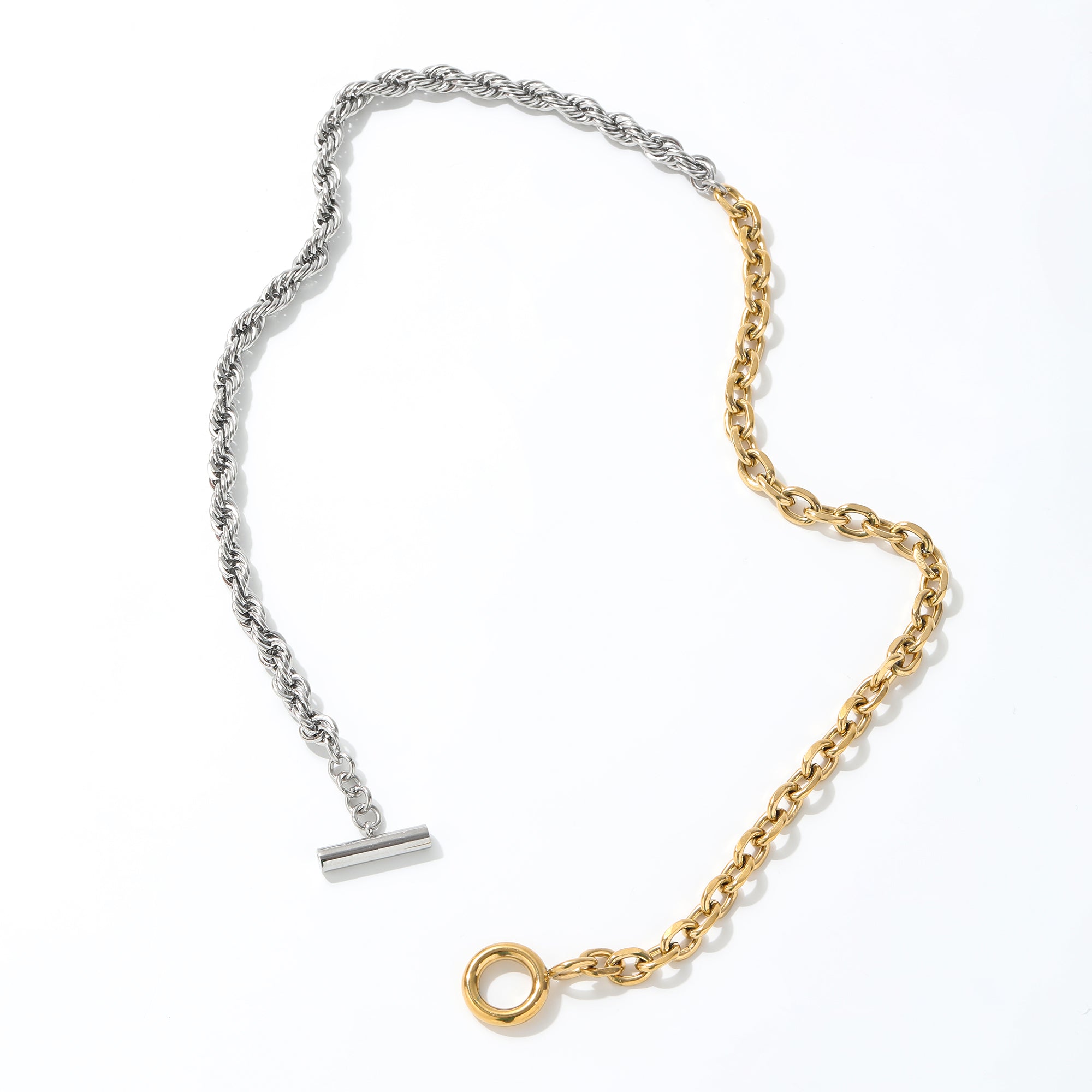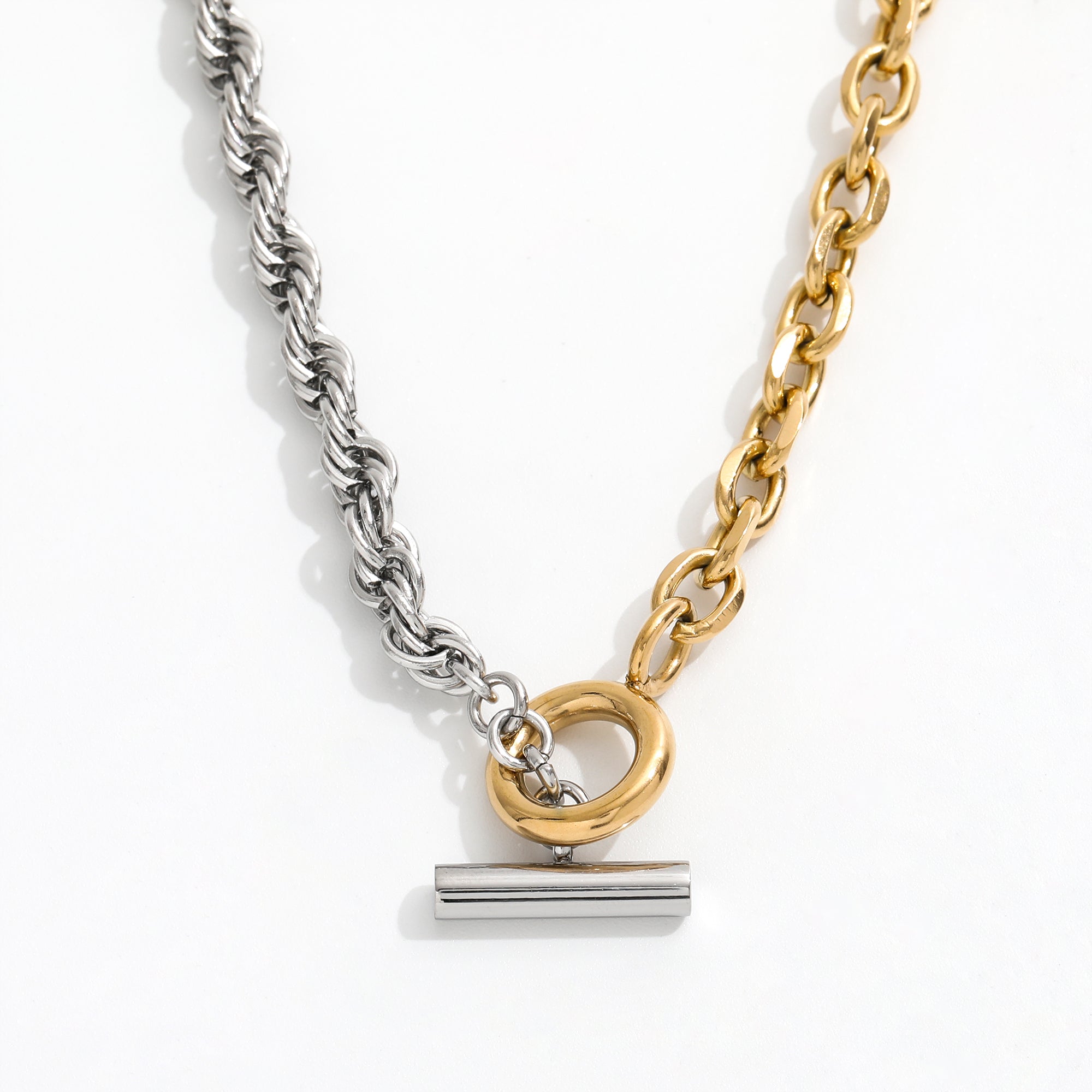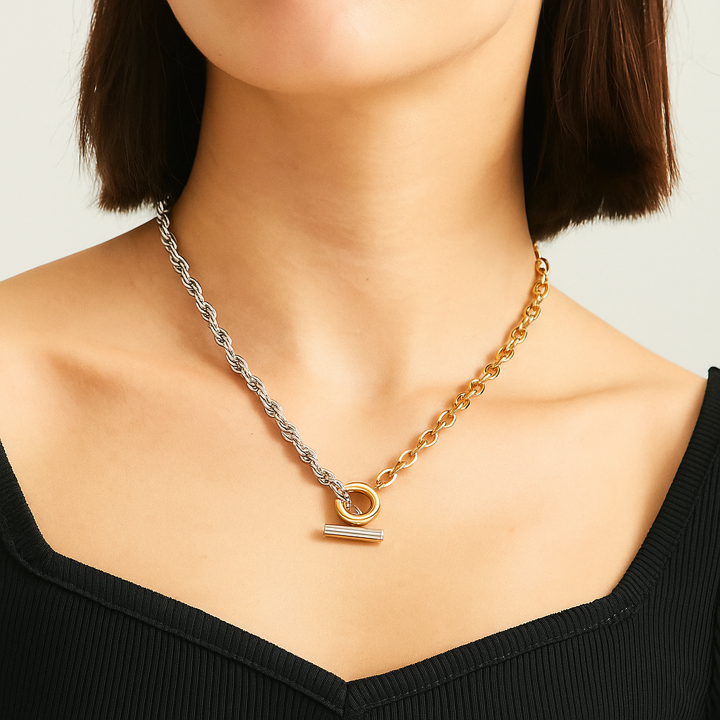 El Collar Amira mezcla el tono plateado con el dorado en un diseño moderno y elegante. Sus eslabones combinan una cadena trenzada con otra clásica, creando una pieza versátil y llamativa. El cierre tipo toggle no solo es práctico, sino también decorativo, convirtiéndose en el detalle que eleva cualquier look.