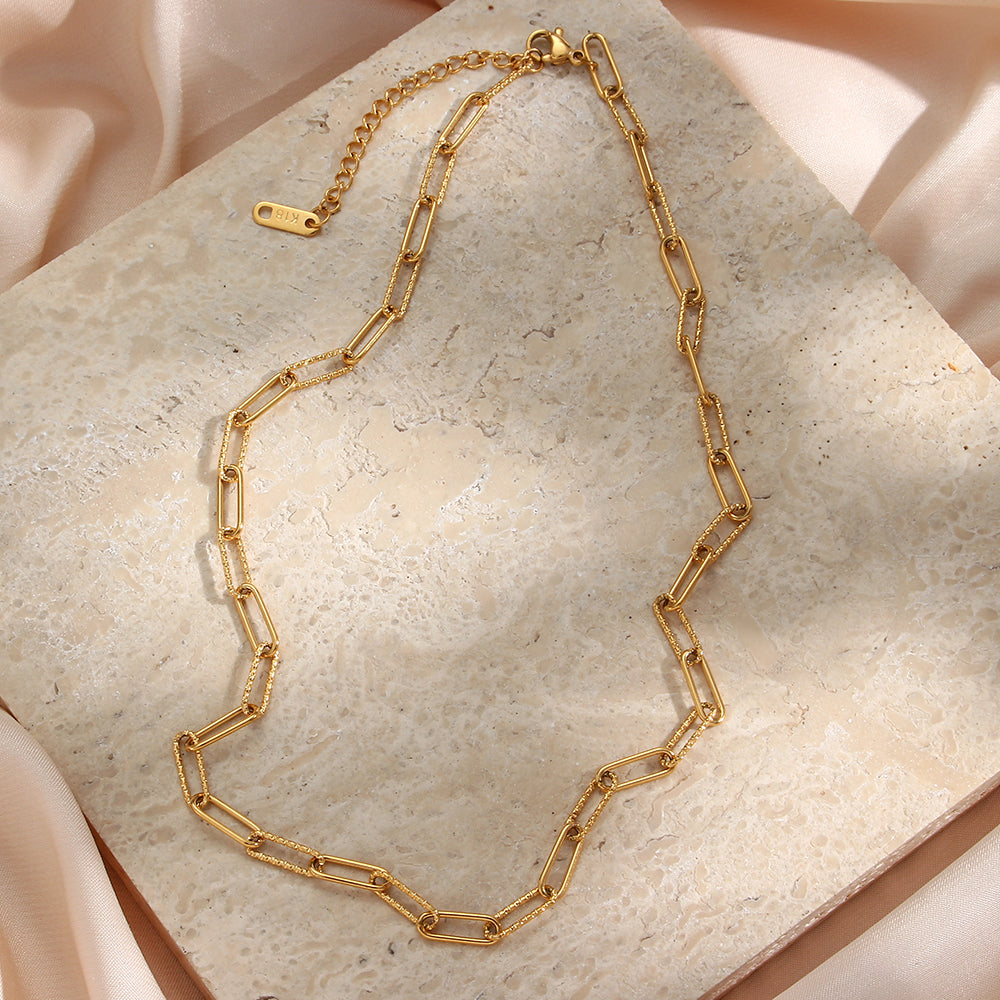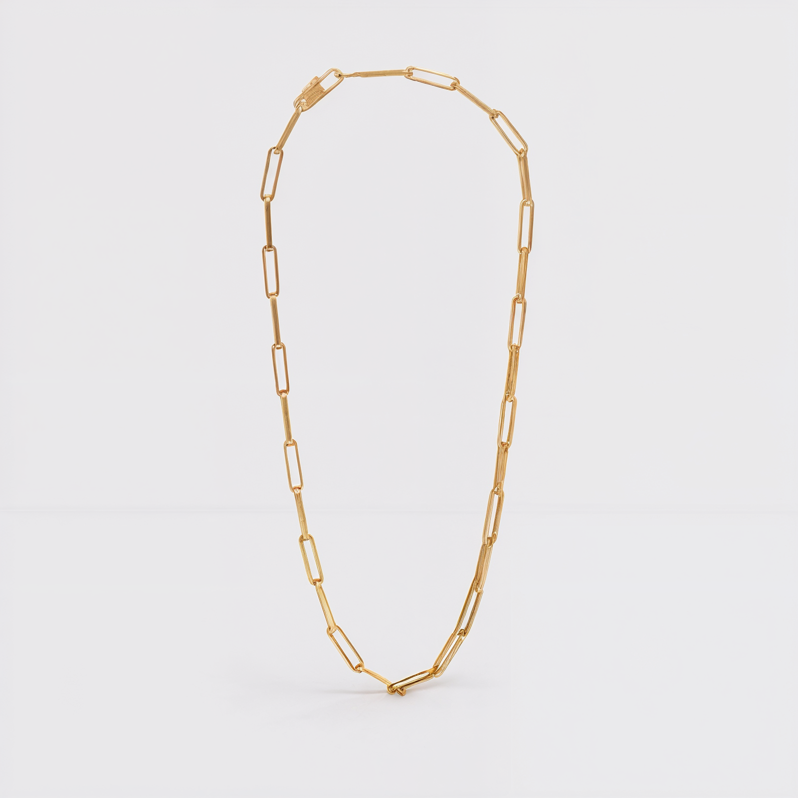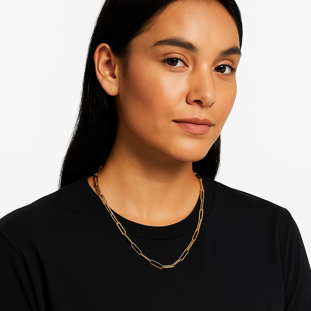 El Collar Anahí es la definición de estilo minimalista con un toque sofisticado. Su diseño de eslabones rectangulares alargados en acero inoxidable 316L con baño en PVD dorado le da un aire moderno y elegante que nunca pasa desapercibido.