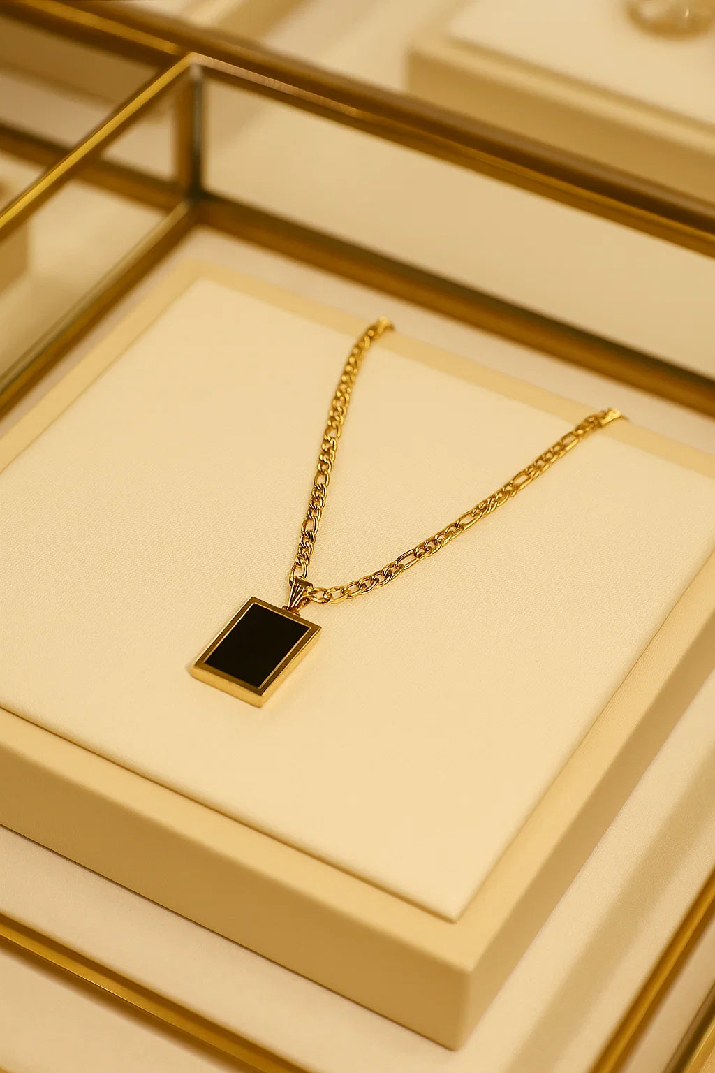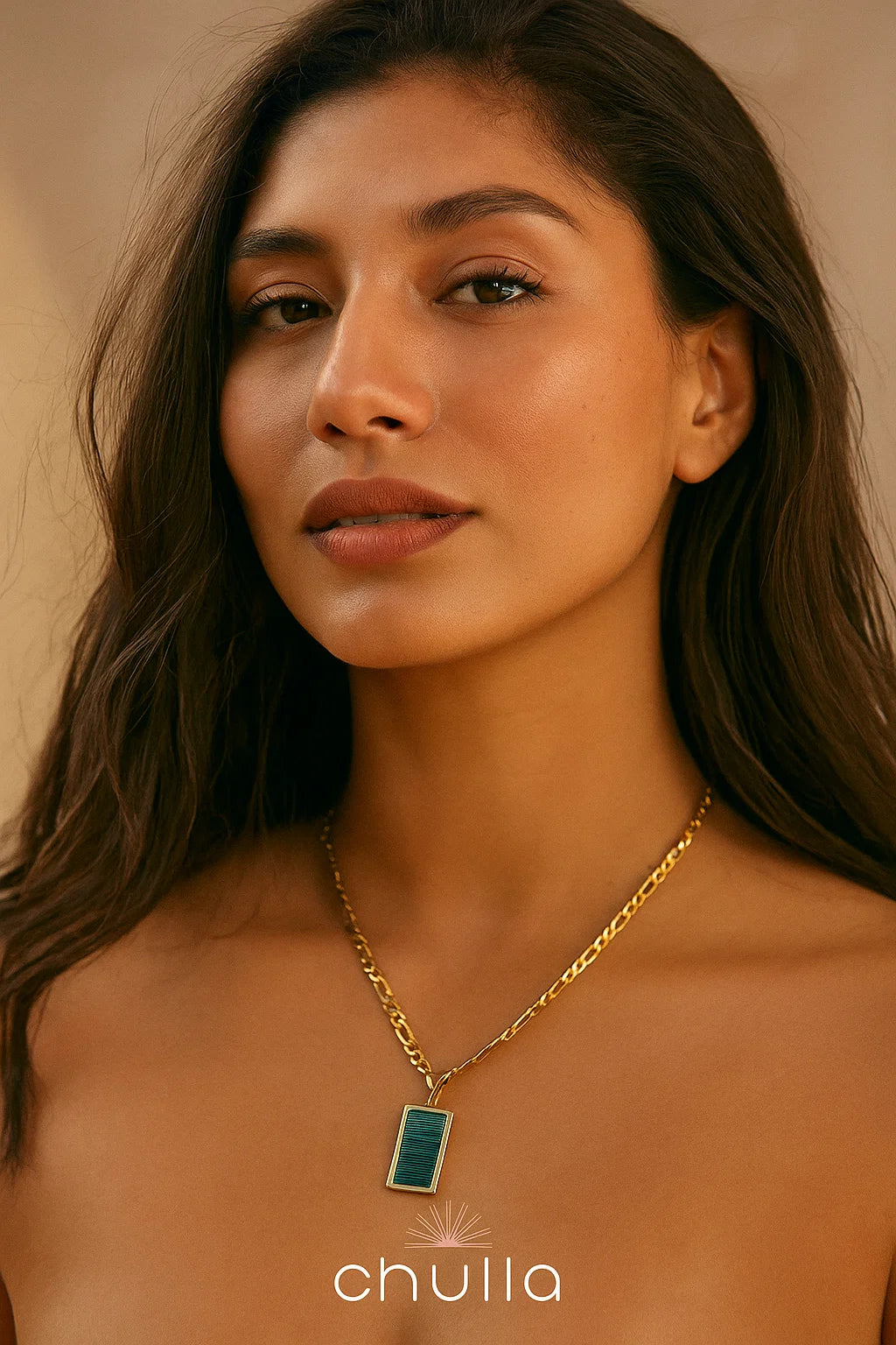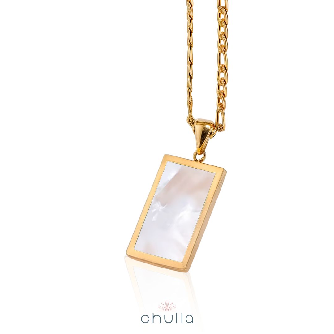 Este delicado collar presenta un dije rectangular con esmalte y detalles en concha, que aporta un aire único y sofisticado. Fabricado en acero inoxidable y con recubrimiento PVD en oro 18K, el collar Carmen destaca por su acabado impecable, resistente y duradero.