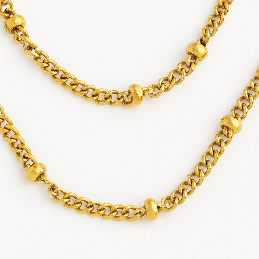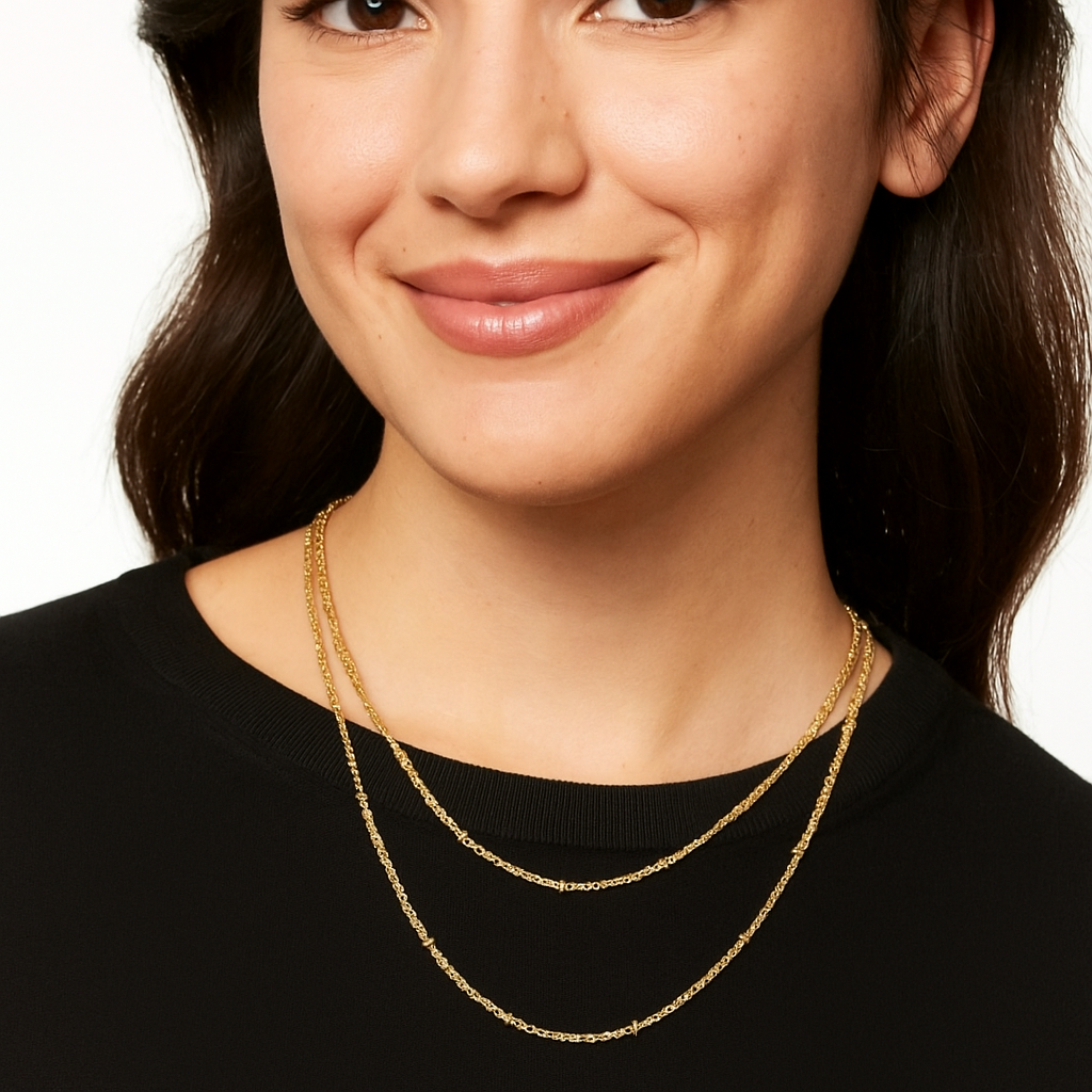 El Collar Clara es la expresión perfecta de sutileza y elegancia. Su diseño de doble cadena con delicados detalles esféricos distribuidos a lo largo del collar crea un efecto luminoso y sofisticado que eleva cualquier look sin esfuerzo.