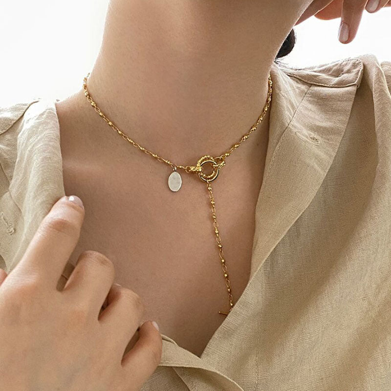 El Collar Elara es una pieza delicada y sofisticada, diseñada con cadena dorada de eslabones finos y cuentas miniatura que aportan textura. Su caída en forma de “Y” y cierre tipo toggle lo hacen perfecto para realzar el cuello y los escotes con un toque moderno y elegante.