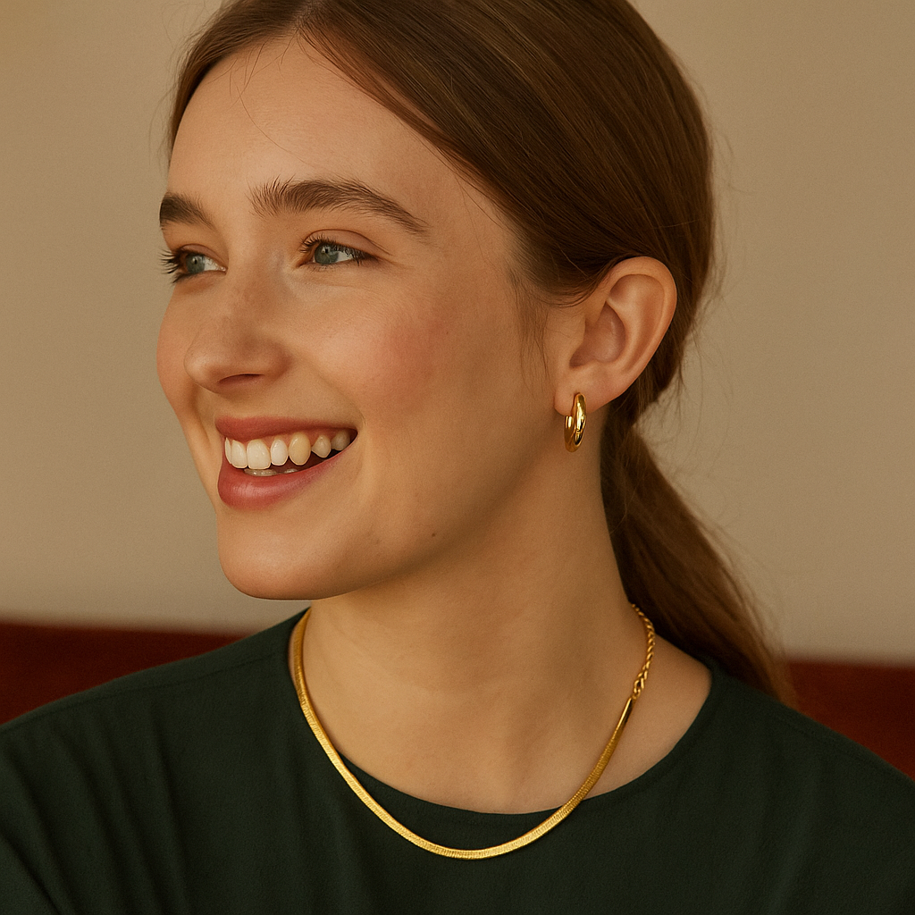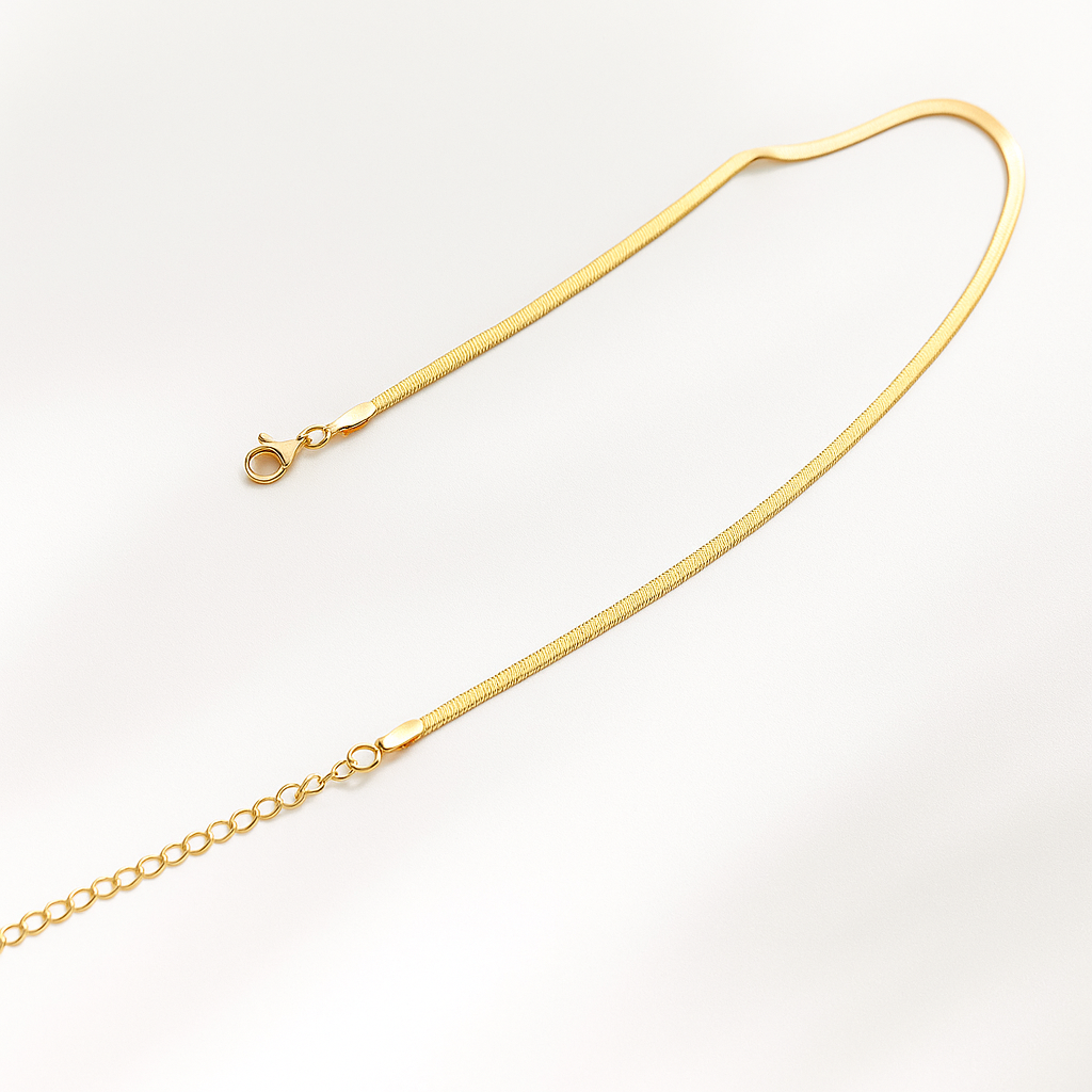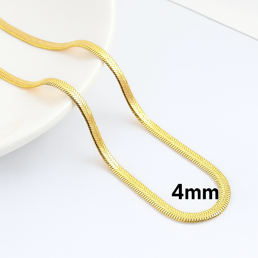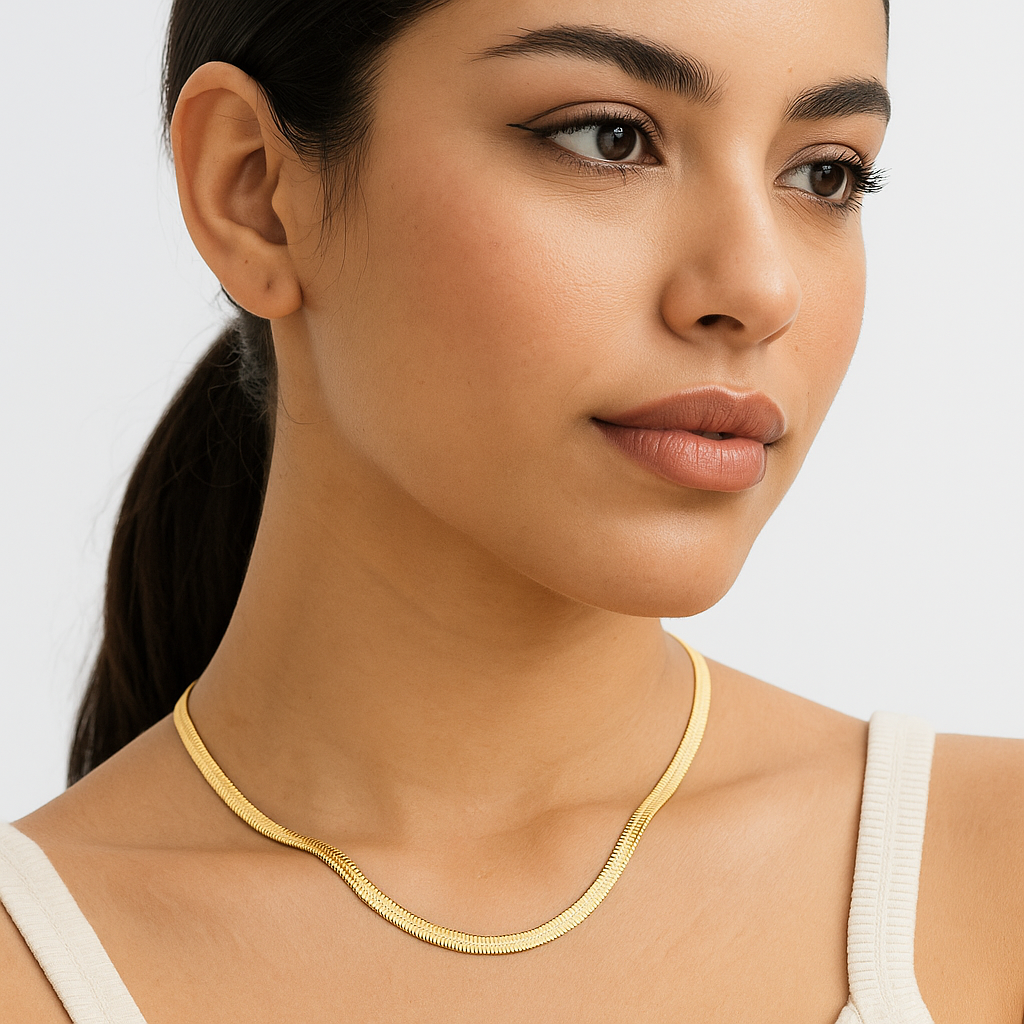 El Collar Kira es una cadena tipo serpiente (herringbone) de acabado espejo que aporta un brillo sutil y sofisticado. Su diseño minimalista y fluido lo convierte en la pieza perfecta para acompañar cualquier look, desde lo casual hasta lo más elegante. Disponible en dos variantes de grosor, 3 mm para un estilo delicado y 4 mm para un impacto más marcado.