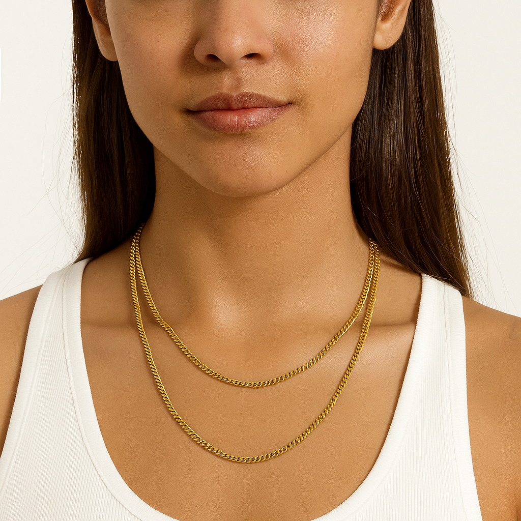 El Collar Lara es un clásico atemporal que nunca pasa de moda. Su diseño de cadena doble tipo gourmet en acero inoxidable 316L con baño en PVD dorado aporta un aire sofisticado y elegante, perfecto para elevar cualquier outfit con un toque moderno y poderoso.