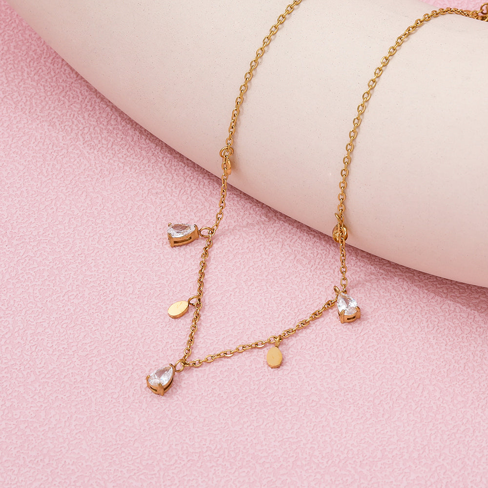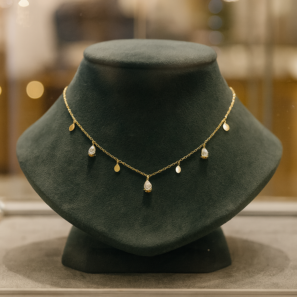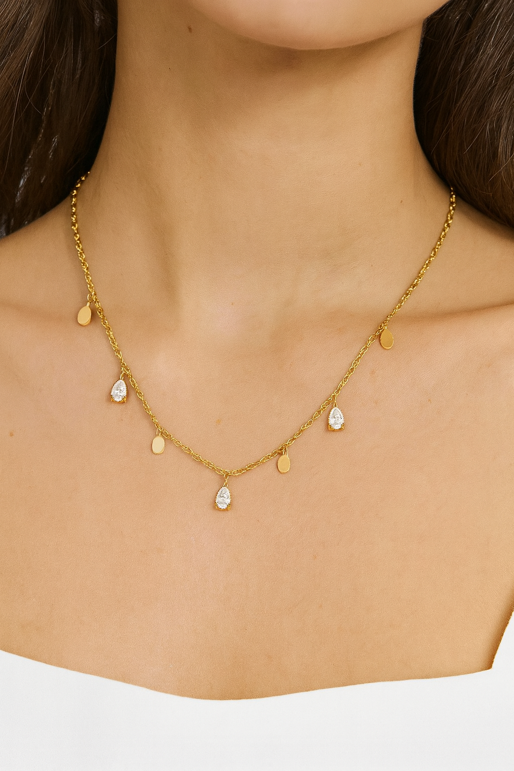 El Collar Libertad combina una fina cadena dorada con dijes colgantes que alternan entre circonitas en corte lágrima y pequeñas placas metálicas. Su diseño aporta movimiento, frescura y un brillo delicado que lo convierten en una joya ideal para realzar cualquier look.
