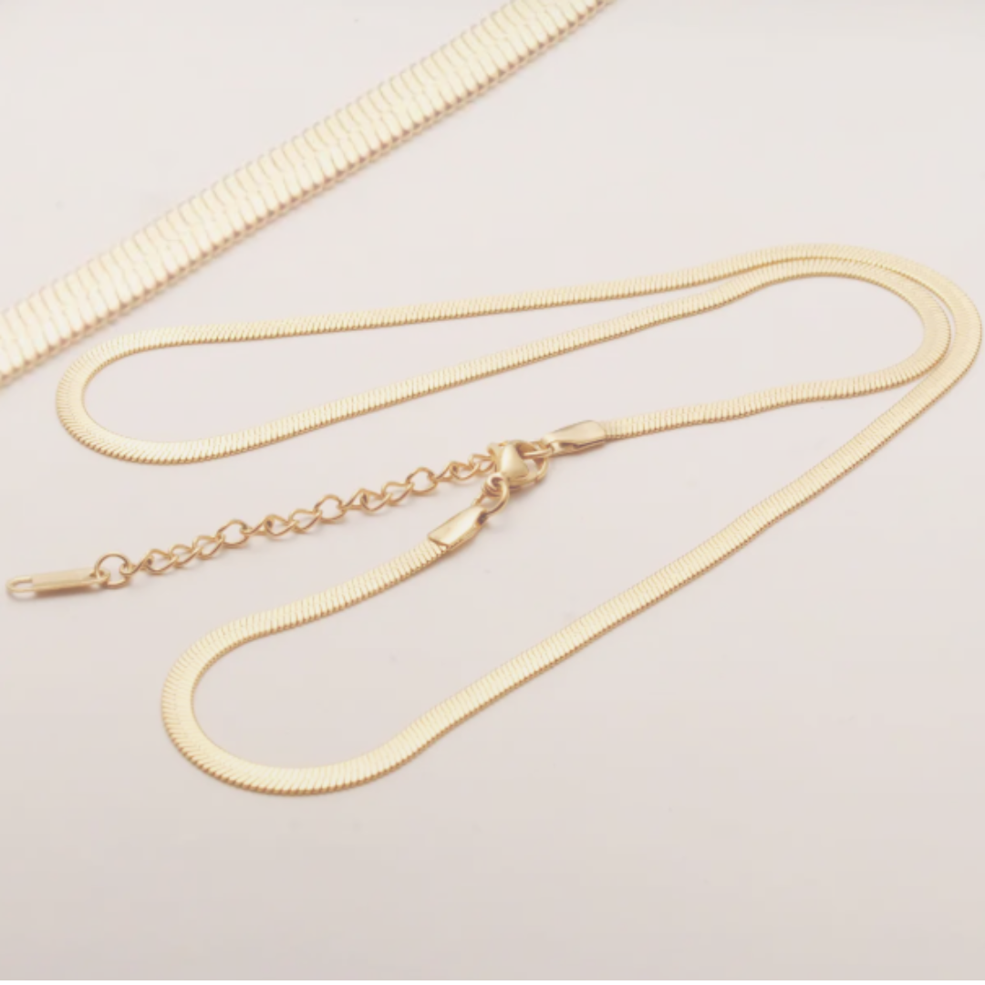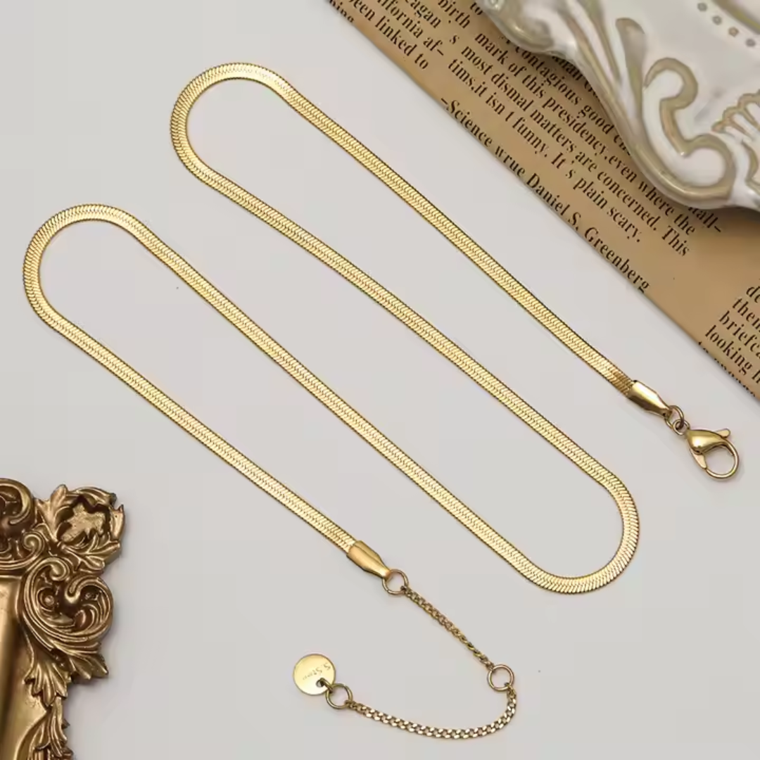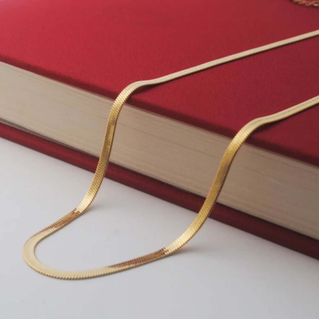 El collar Liora es la definición perfecta de sofisticación minimalista. Su diseño plano tipo "snake chain" y el delicado acabado en oro 14K crean un brillo suave y refinado que capta la luz desde todos los ángulos.