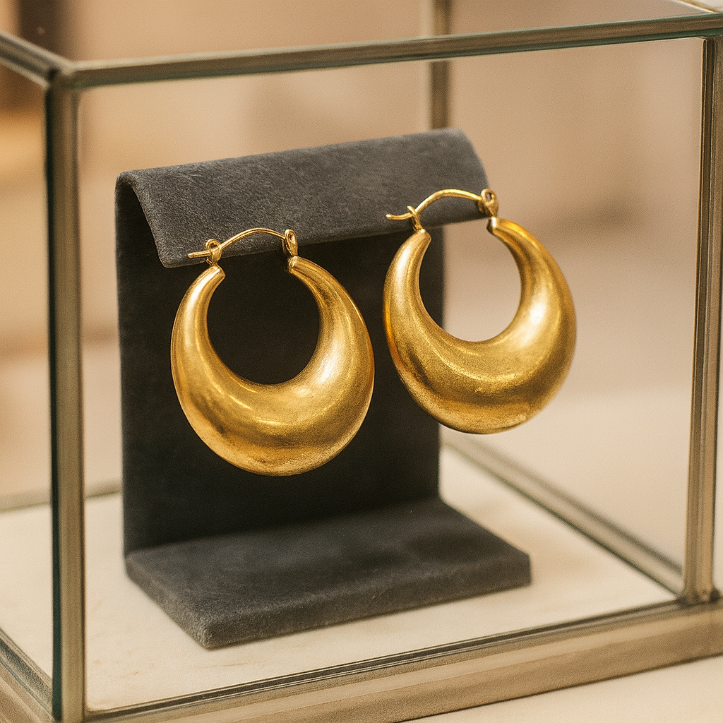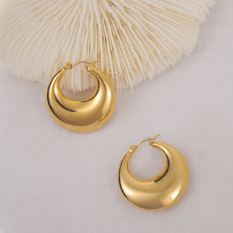 Los Aretes Paula de CHULLA irradian fuerza y sofisticación. Su diseño curvo tipo “crescent” en acabado dorado refleja la luz con cada movimiento, evocando confianza y feminidad. Fabricados en acero inoxidable, son resistentes al agua, hipoalergénicos y cuentan con 2 años de garantía, acompañándote con estilo en tu día a día. Ideales para realzar un look moderno y seguro, desde una reunión hasta una noche especial.