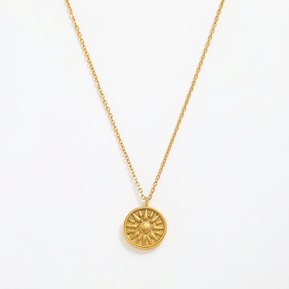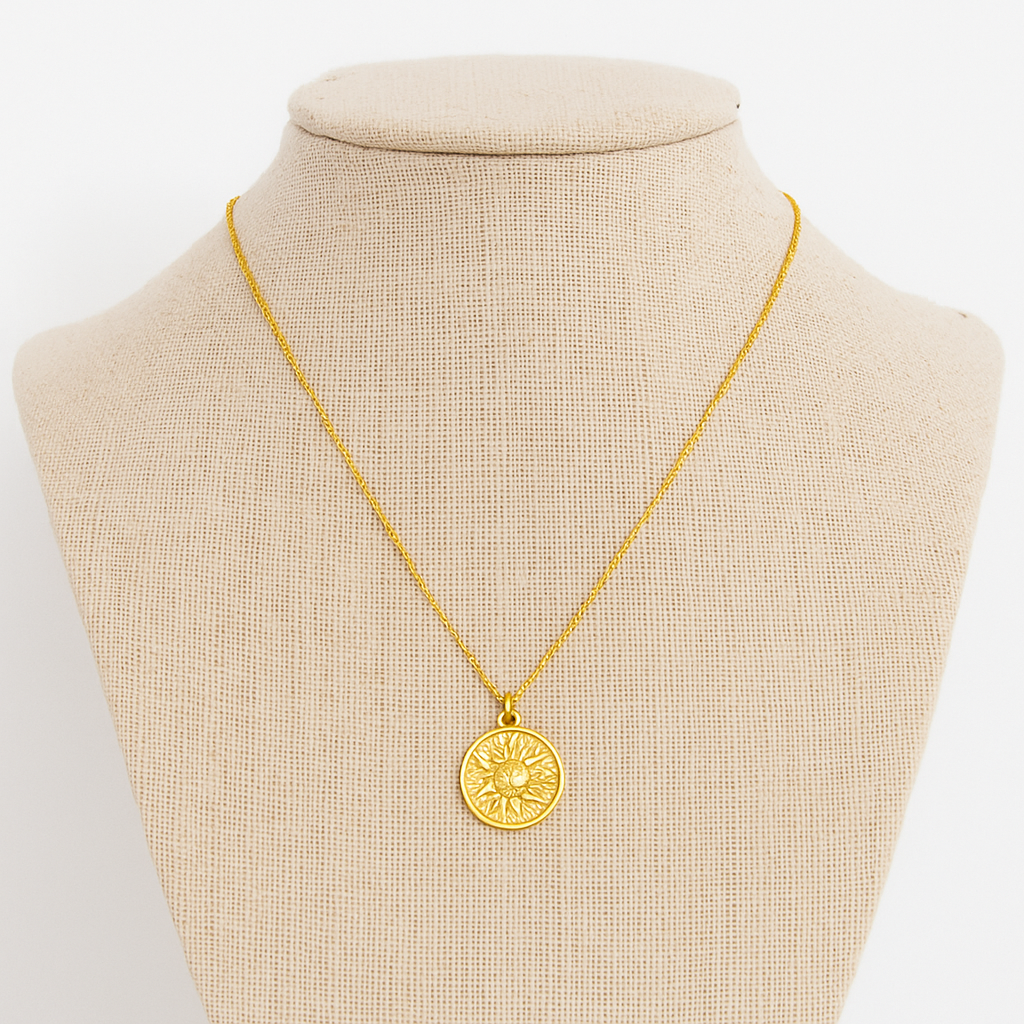El Collar Sol es una joya cargada de energía y simbolismo. Su dije circular con un sol tallado en relieve representa luz, fuerza y vitalidad, convirtiéndolo en un accesorio especial que ilumina cualquier look con su brillo dorado.