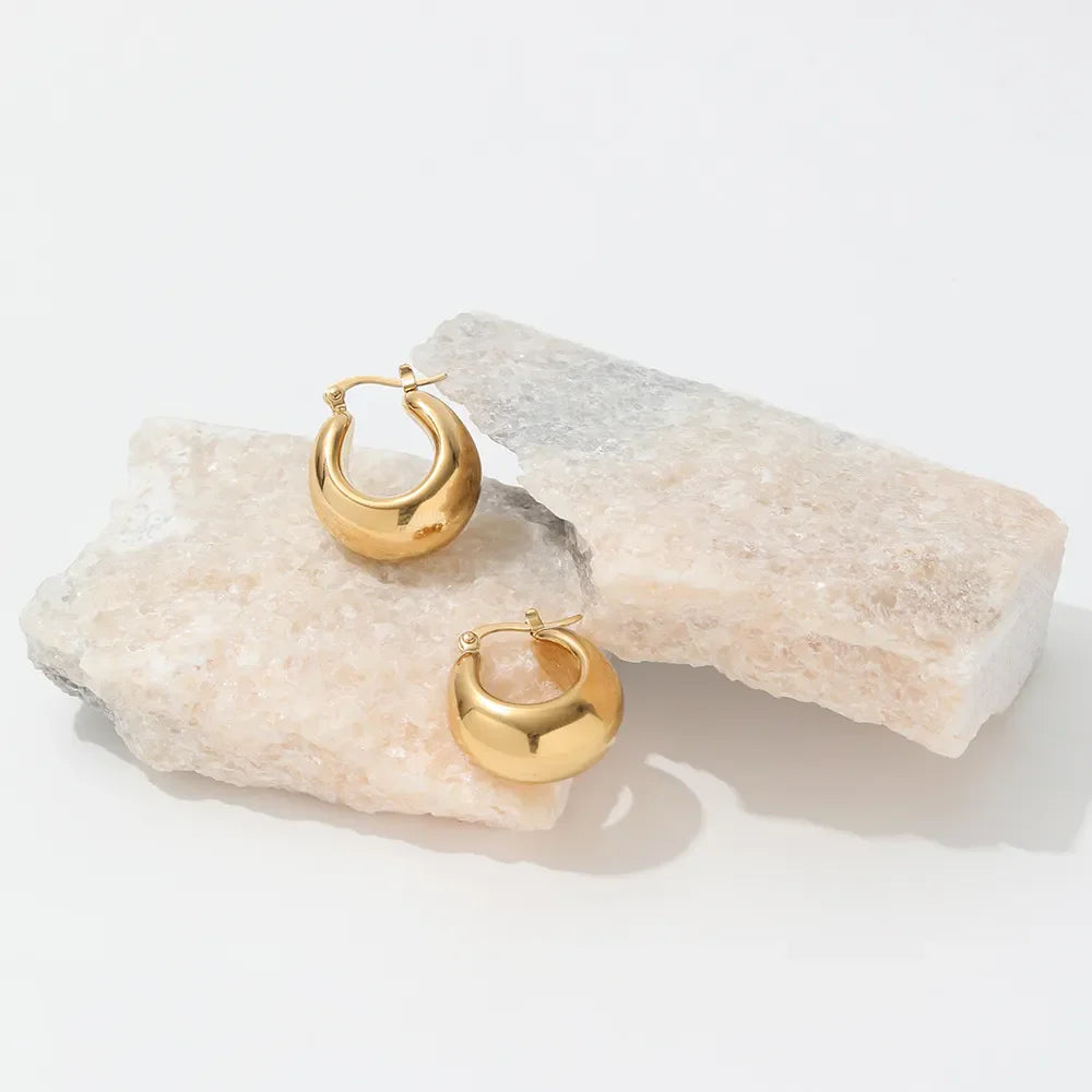 Elaborados en acero inoxidable de alta calidad y bañados en oro 14K, estos hoops destacan por su acabado brillante y pulido que captura la luz de manera espectacular. Gracias a su recubrimiento PVD, son completamente resistentes al agua y al desgaste diario.