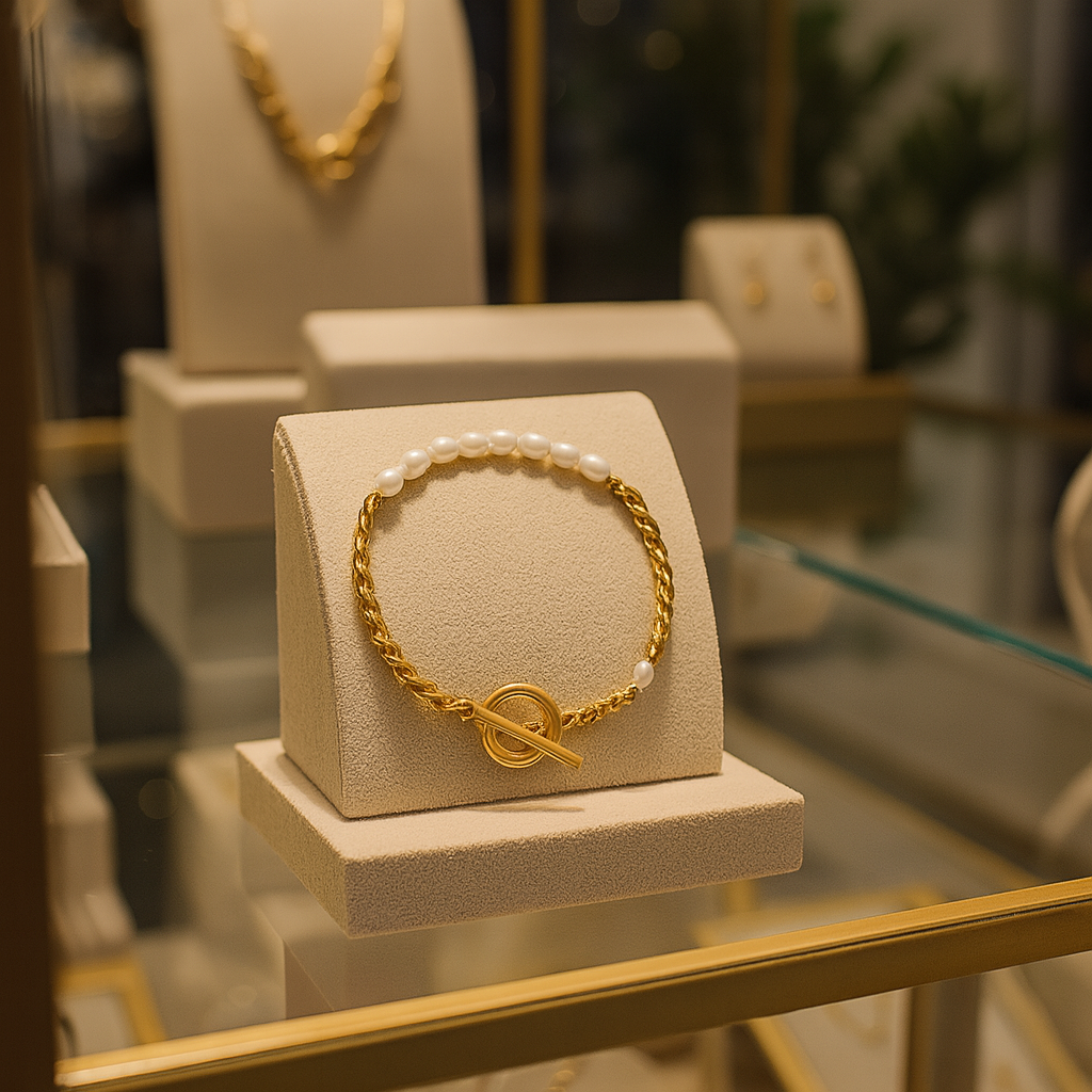 La Pulsera Helios es un diseño elegante y original que combina una cadena dorada con perlas sintéticas, creando un contraste único entre lo clásico y lo moderno. Su cierre tipo barra en “T” añade un detalle sofisticado y práctico que la convierte en una pieza distintiva.