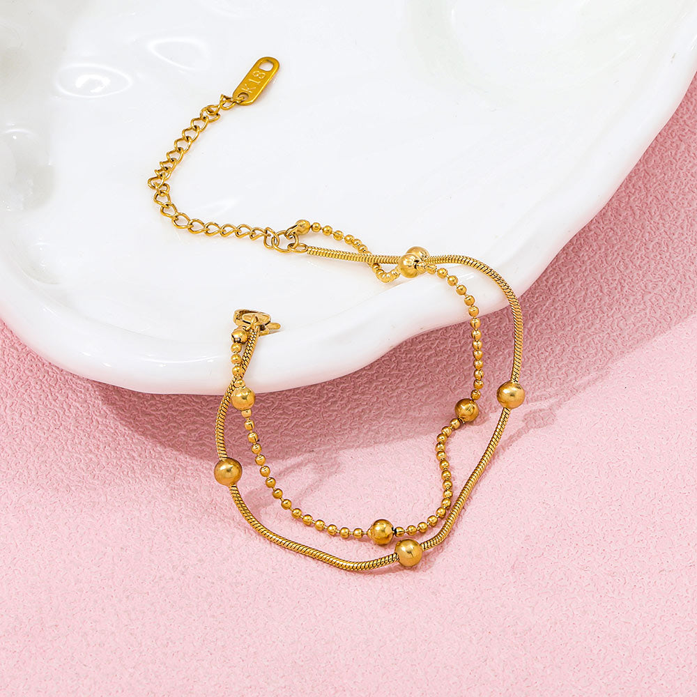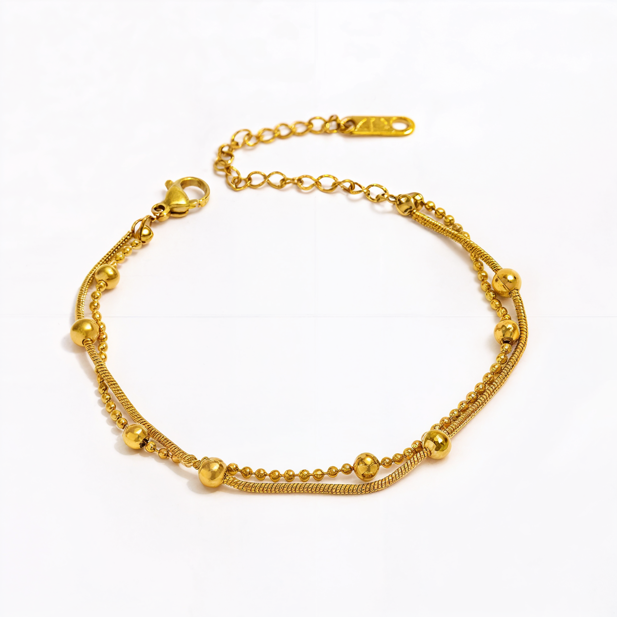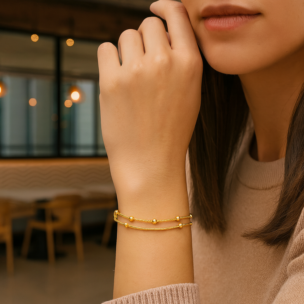 La Pulsera Joliette es un diseño elegante y delicado con múltiples hileras finas adornadas con pequeñas esferas doradas, que aportan movimiento y brillo a cada detalle. Su estilo refinado la convierte en la elección perfecta para mujeres que buscan un accesorio versátil: ideal para el uso diario, pero también para complementar atuendos más sofisticados.
