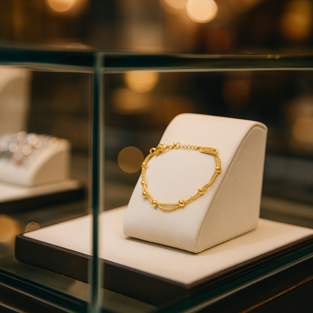 Confeccionada en acero inoxidable 316L con recubrimiento PVD dorado, esta pulsera es hipoalergénica, resistente al agua y de alta durabilidad, garantizando que mantenga su acabado impecable con el paso del tiempo.