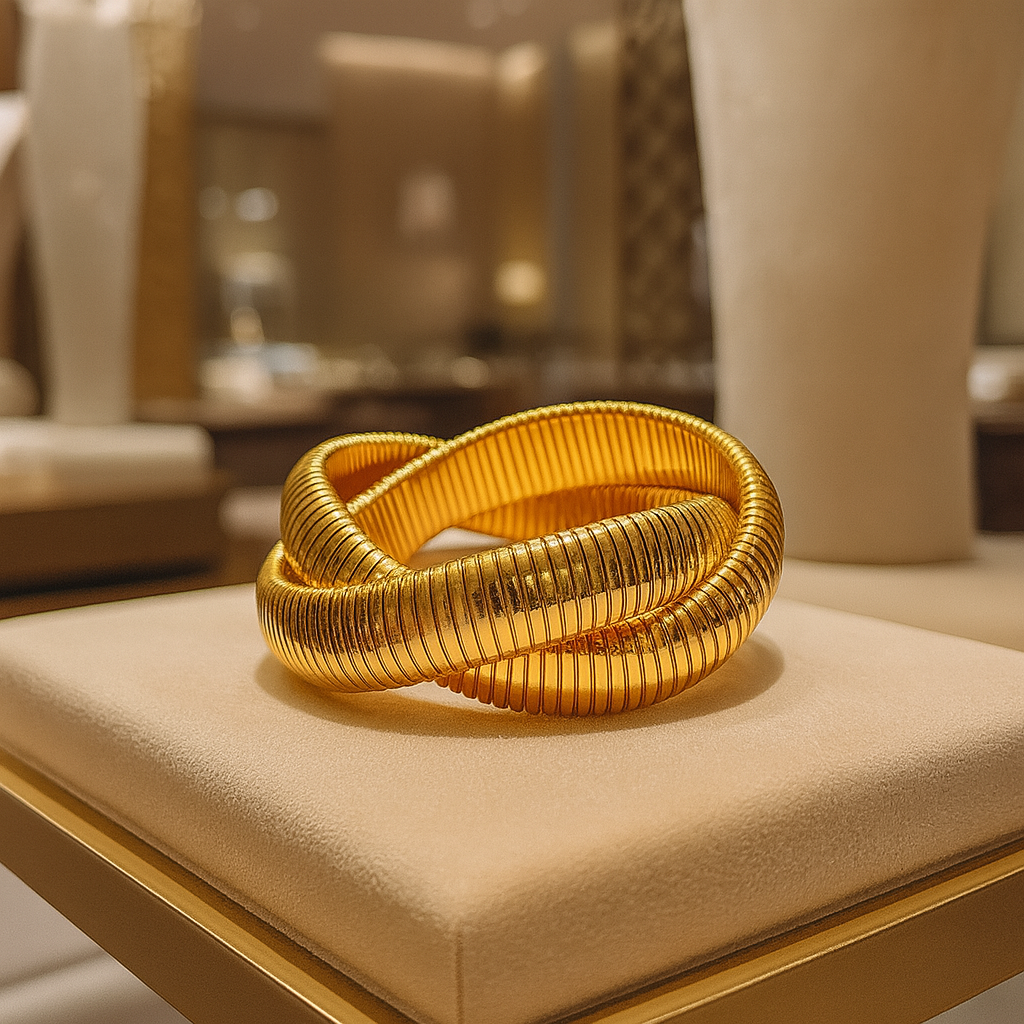 La Pulsera Odelia es un brazalete ancho y trenzado que destaca por su diseño elegante y sofisticado. Su acabado metálico brillante la convierte en una joya llamativa, perfecta para quienes desean un accesorio con presencia que complemente tanto looks formales como atuendos de estilo moderno.